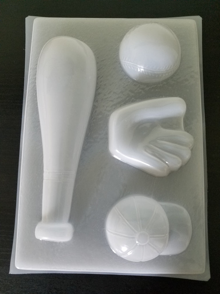 Molde para gelatina en forma de accesorios de Beisból medida del bat 9", medida del balon 3" medida del guante 3.5 y medida de la gorra 3.5"